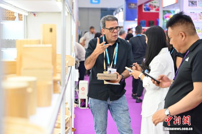 图为境中推销商(左两、左1)取参铺洽商道。中新社记者 旧骥旻 摄